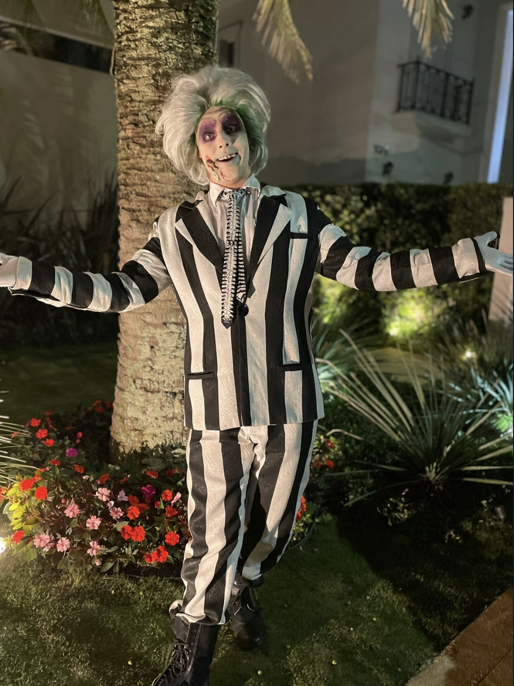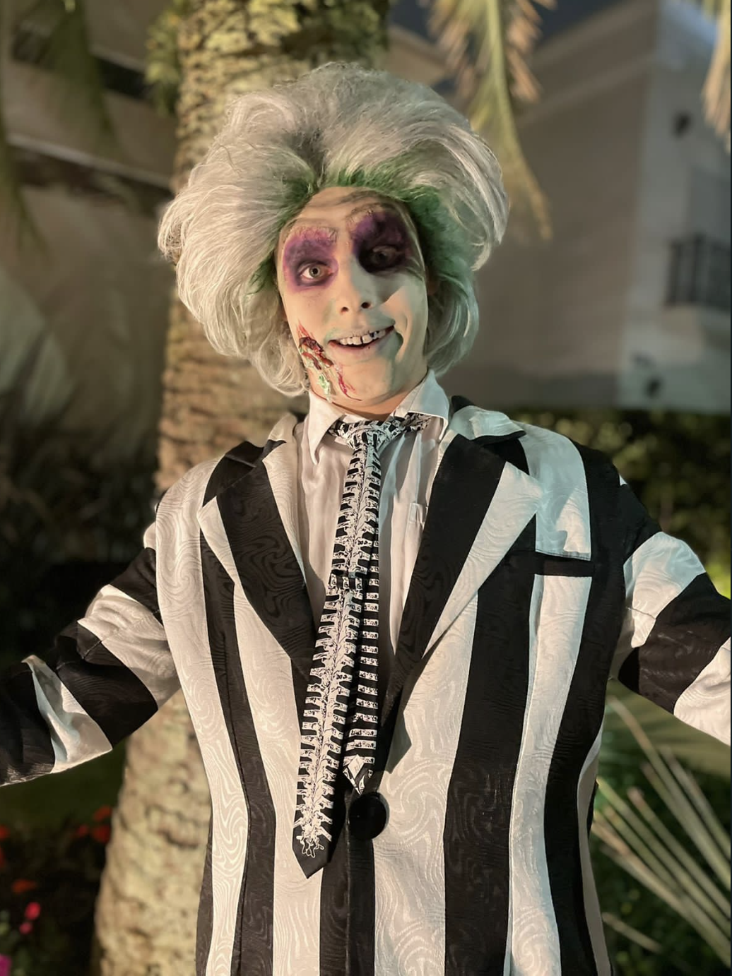 Beetlejuice, inspirado no clássico cult dirigido por Tim Burton, traz um visual excêntrico, divertido e misterioso, perfeito para festas temáticas e eventos criativos. Com seu icônico terno listrado, cabelo bagunçado e maquiagem marcante, o personagem carrega uma estética sombria, mas ao mesmo tempo divertida e envolvente, criando uma experiência inesquecível para o público.