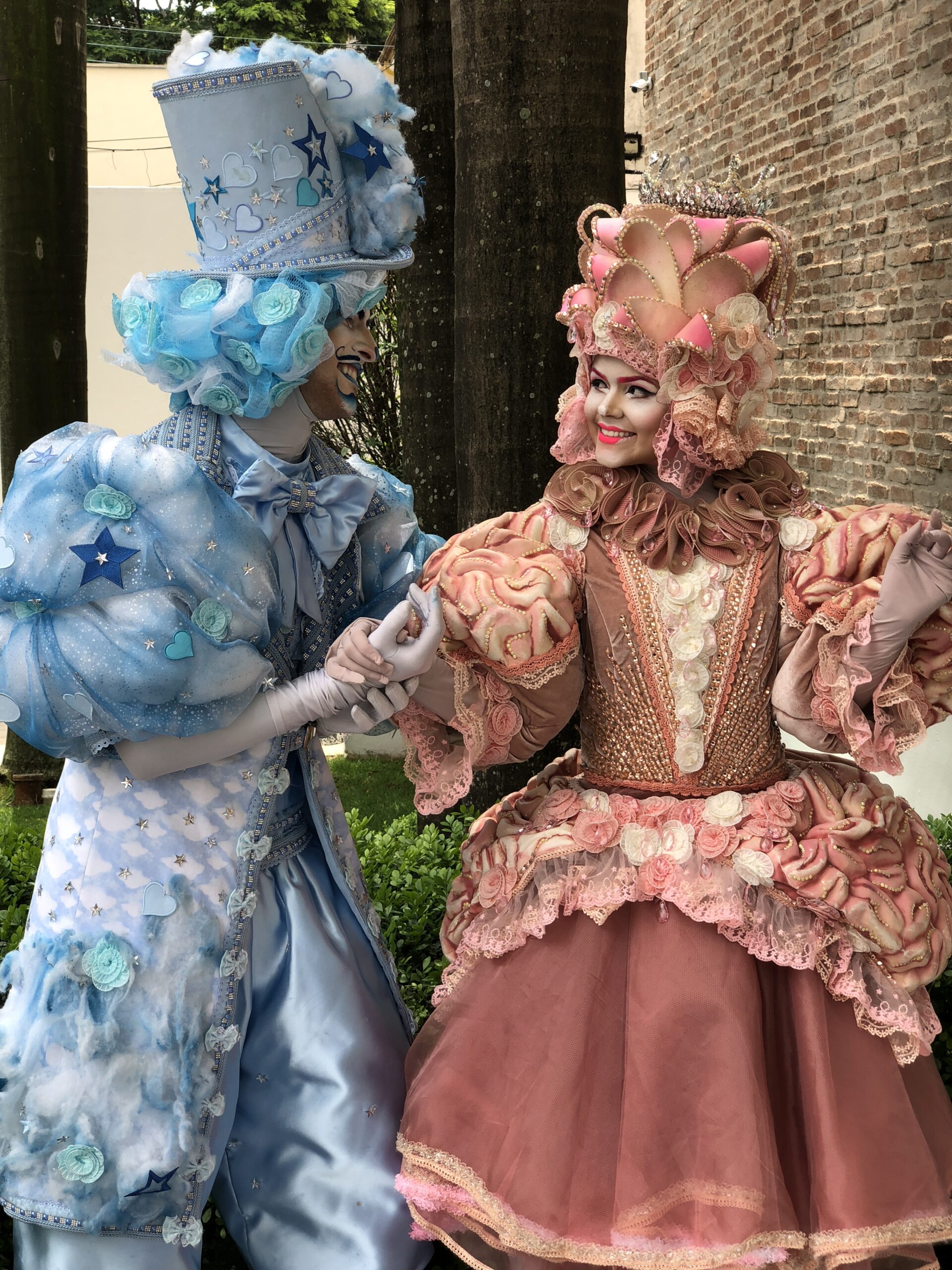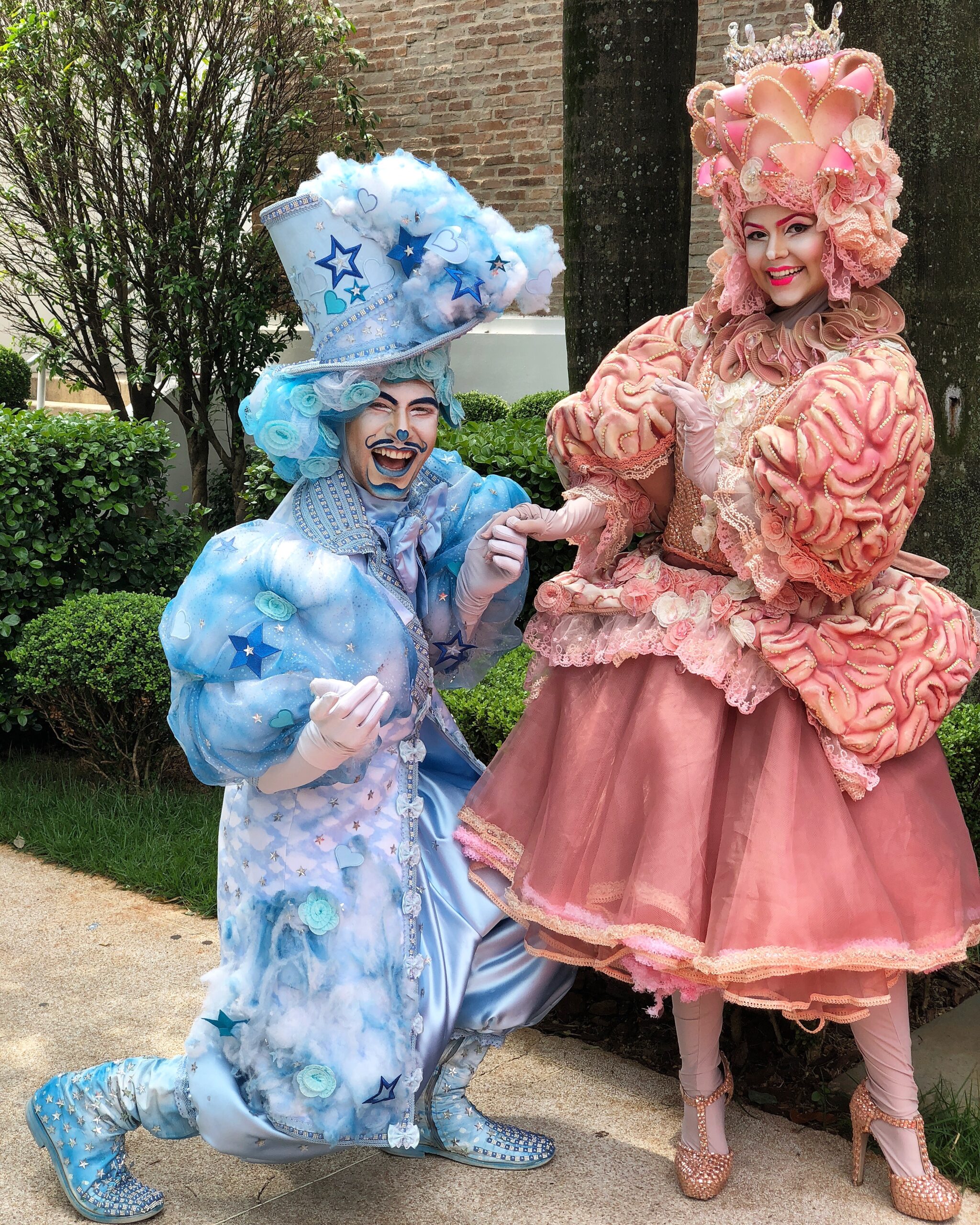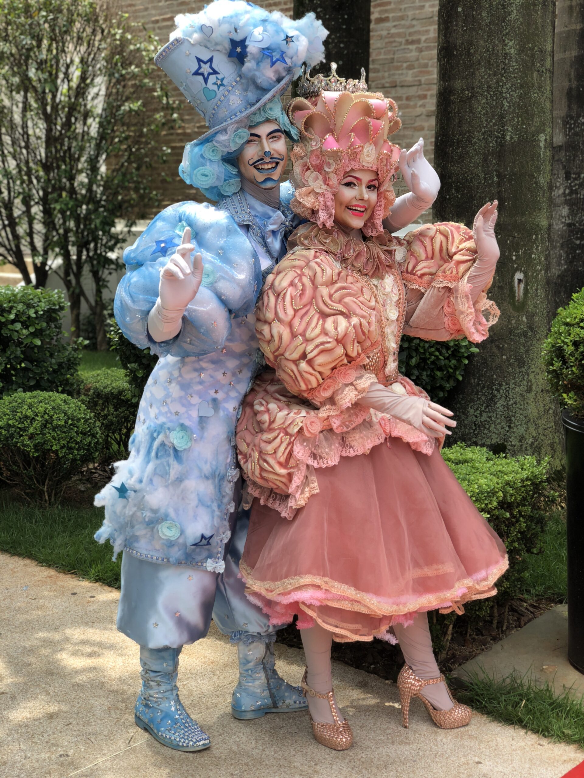 Um casal de personagens imponentes e encantadores, representando a dualidade entre razão e emoção. Vestidos com figurinos luxuosos, cheios de texturas, volumes e detalhes delicados, eles criam uma aura mágica e sofisticada. O contraste entre os tons suaves e os elementos exuberantes transmite uma atmosfera única, perfeita para eventos que pedem impacto visual e um toque de fantasia.