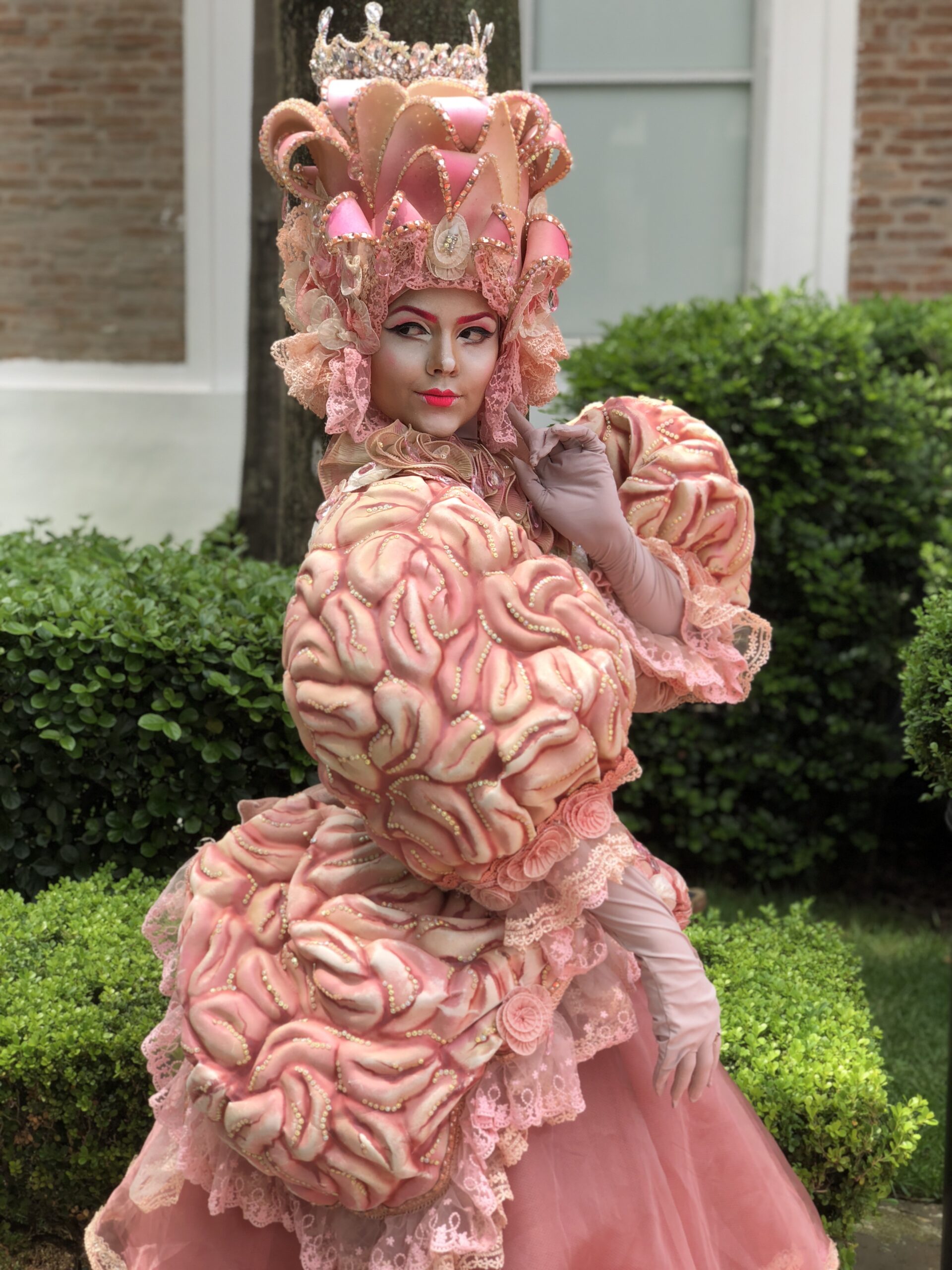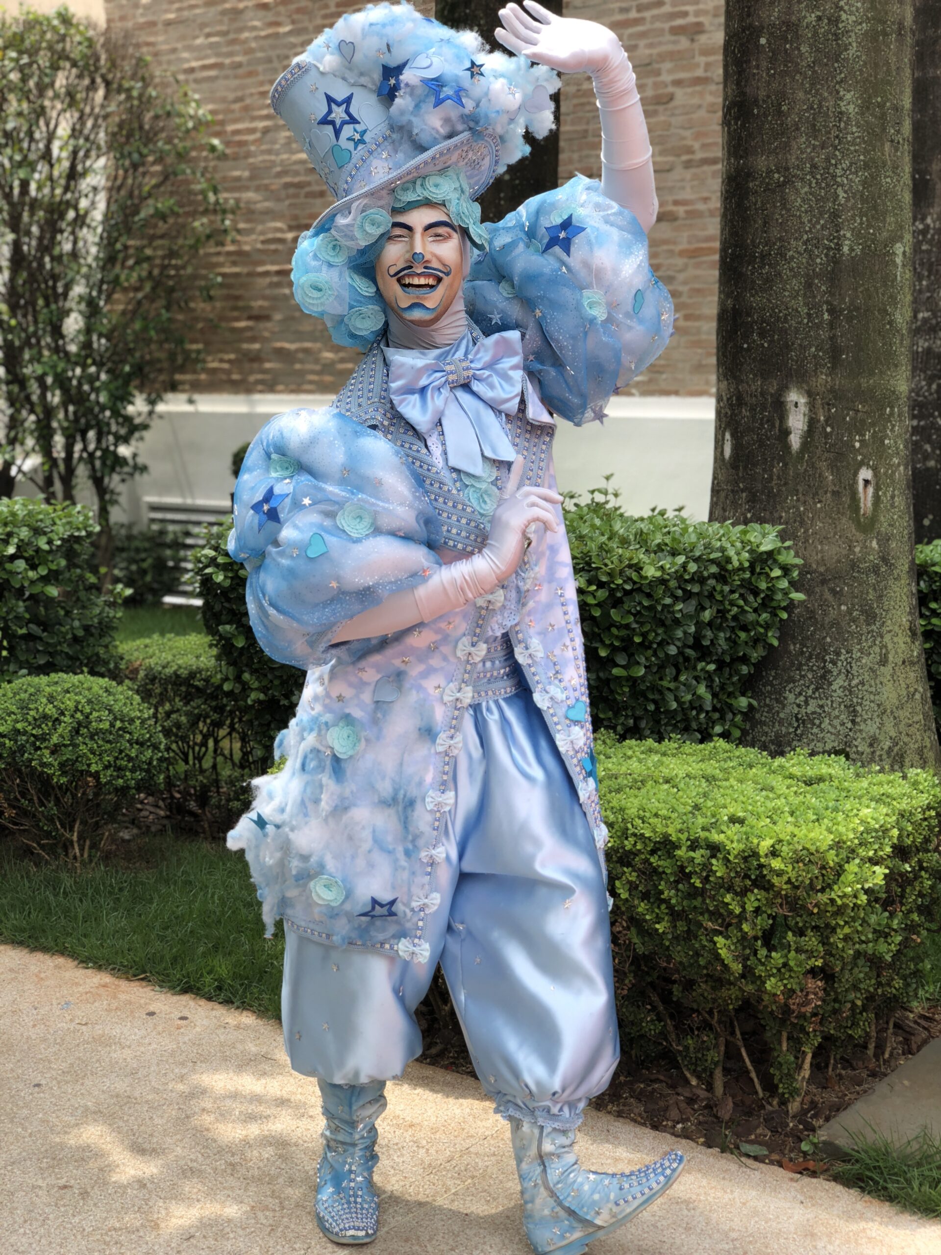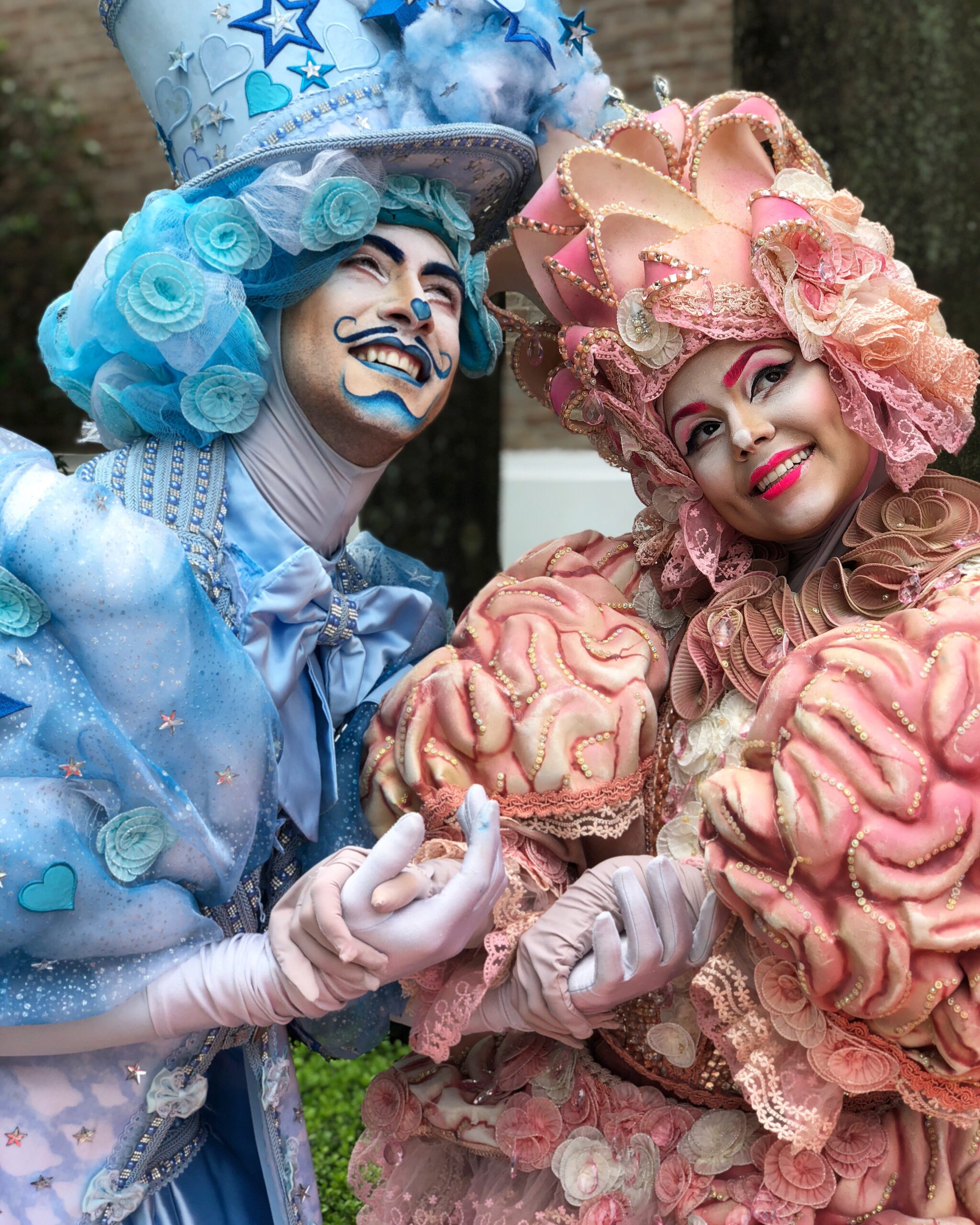 Um casal de personagens imponentes e encantadores, representando a dualidade entre razão e emoção. Vestidos com figurinos luxuosos, cheios de texturas, volumes e detalhes delicados, eles criam uma aura mágica e sofisticada. O contraste entre os tons suaves e os elementos exuberantes transmite uma atmosfera única, perfeita para eventos que pedem impacto visual e um toque de fantasia.