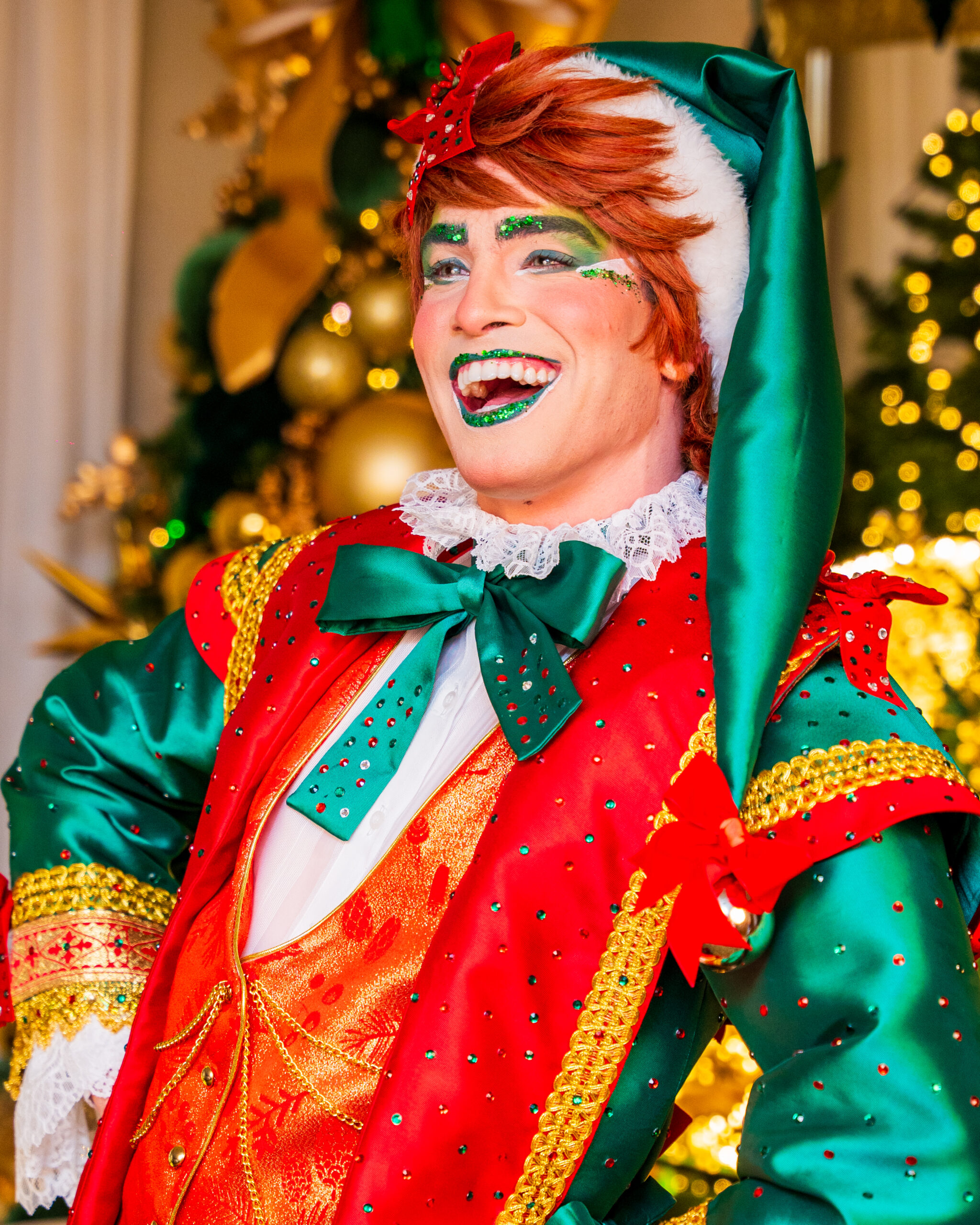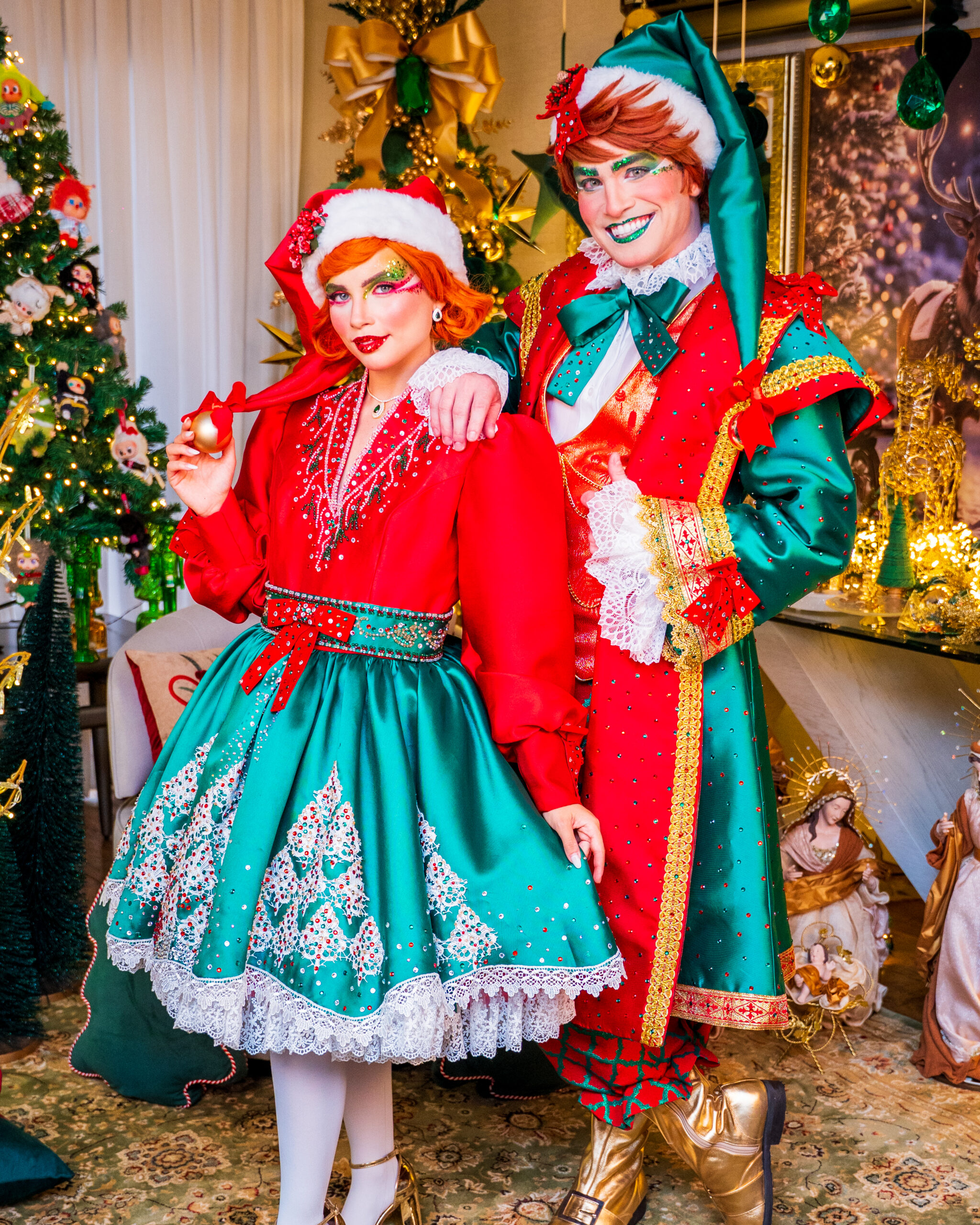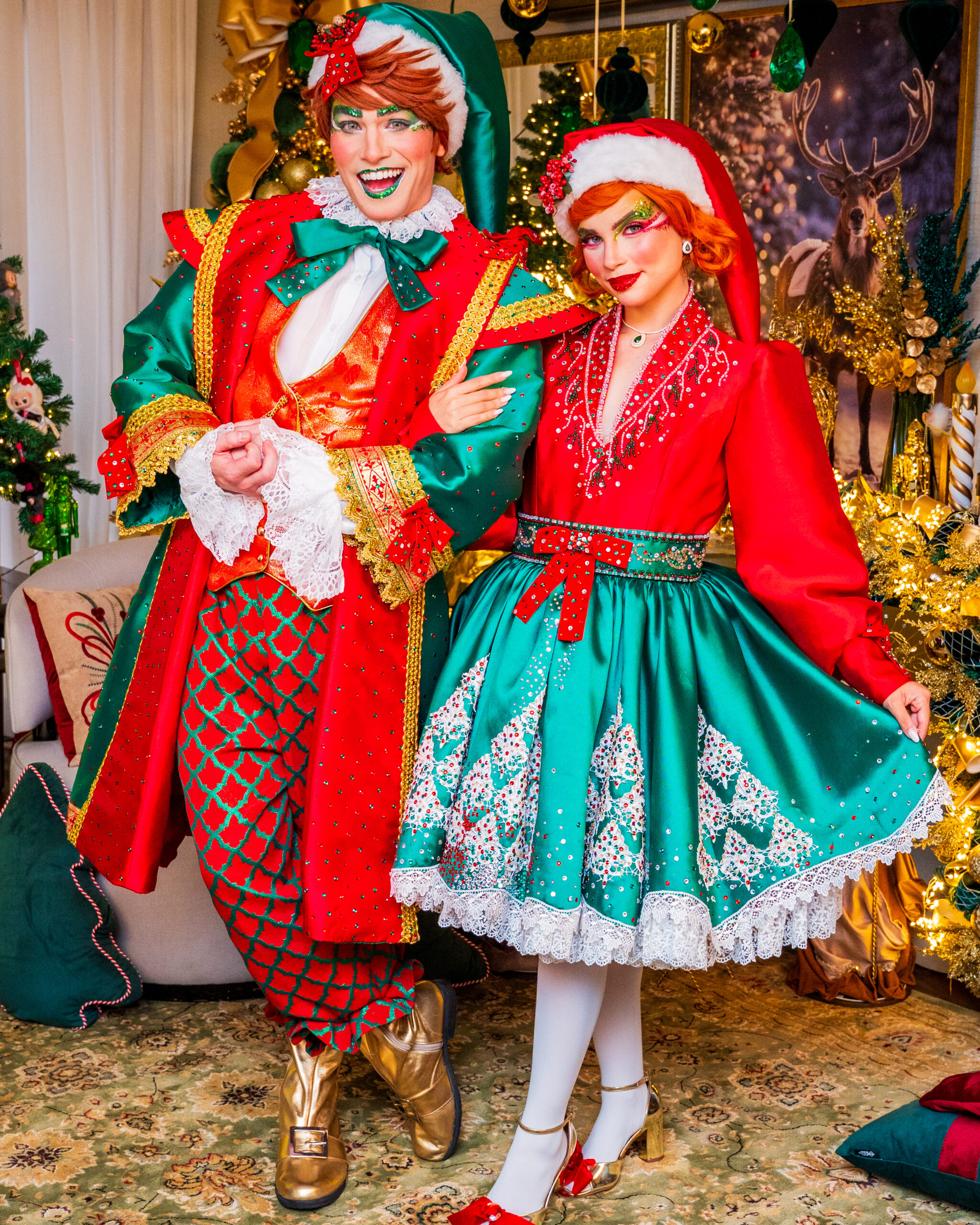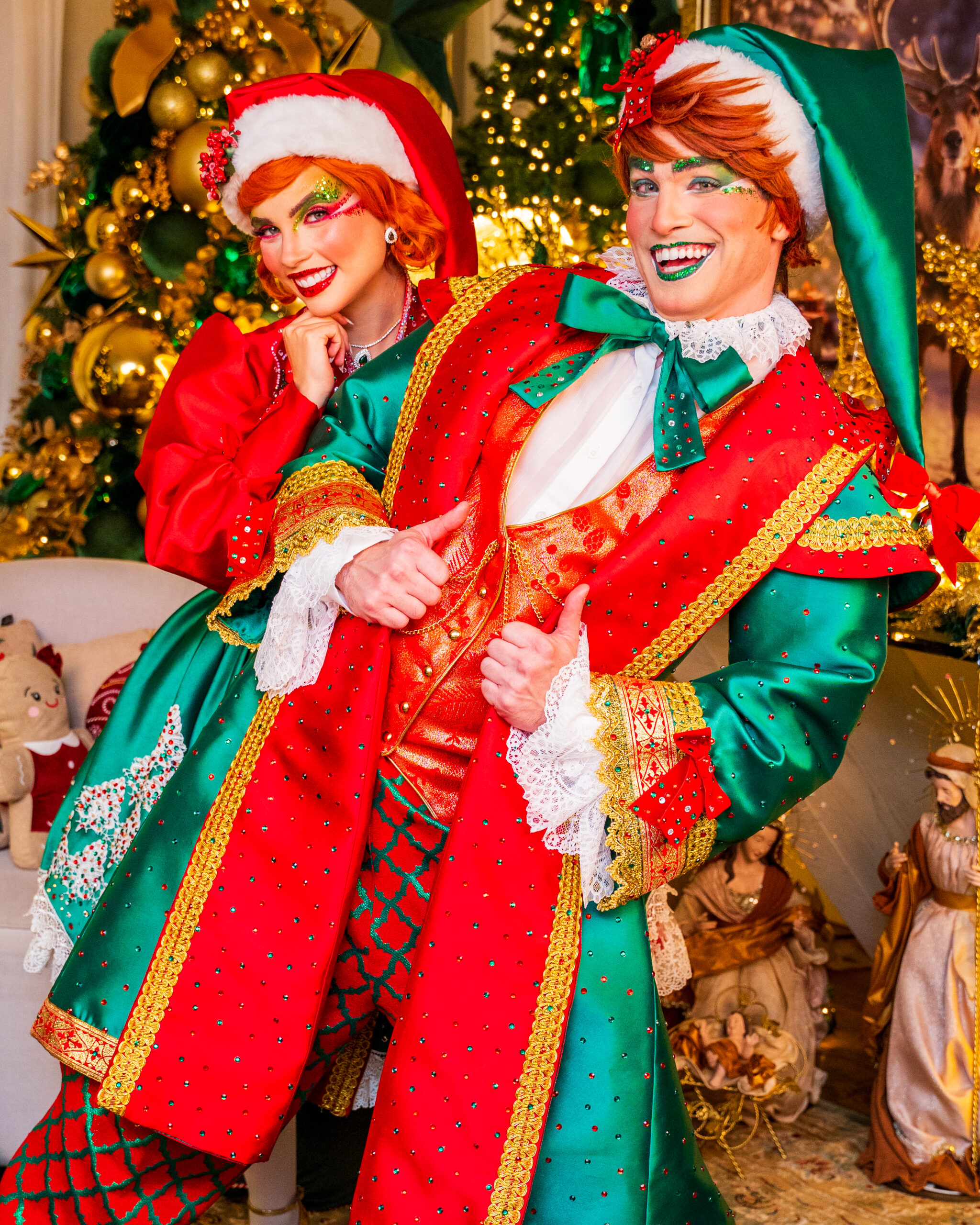 Com seus trajes brilhantes em tons de vermelho-rubi e verde-esmeralda, eles espalham risadas, energia e encanto por onde passam. Sempre animados e prontos para ajudar, transformam cada evento em uma festa divertida, colorida e cheia do verdadeiro espírito natalino.