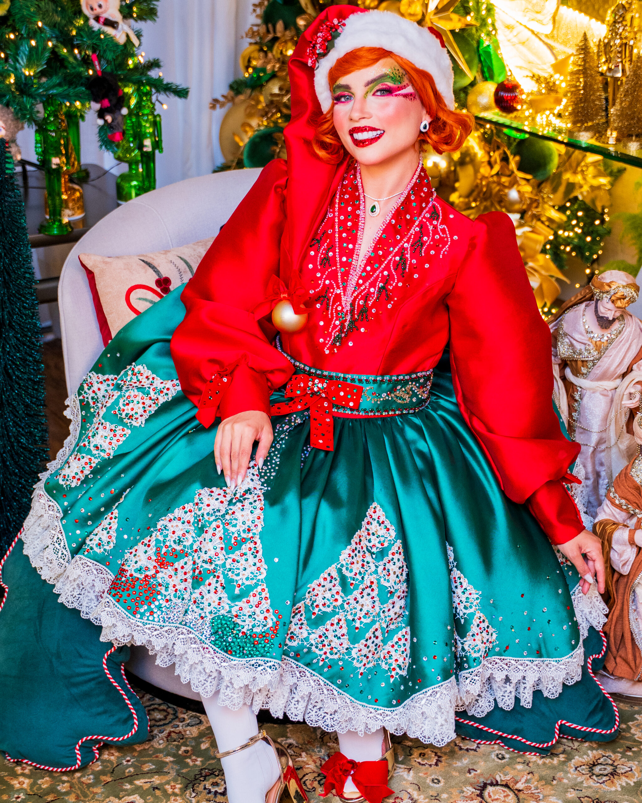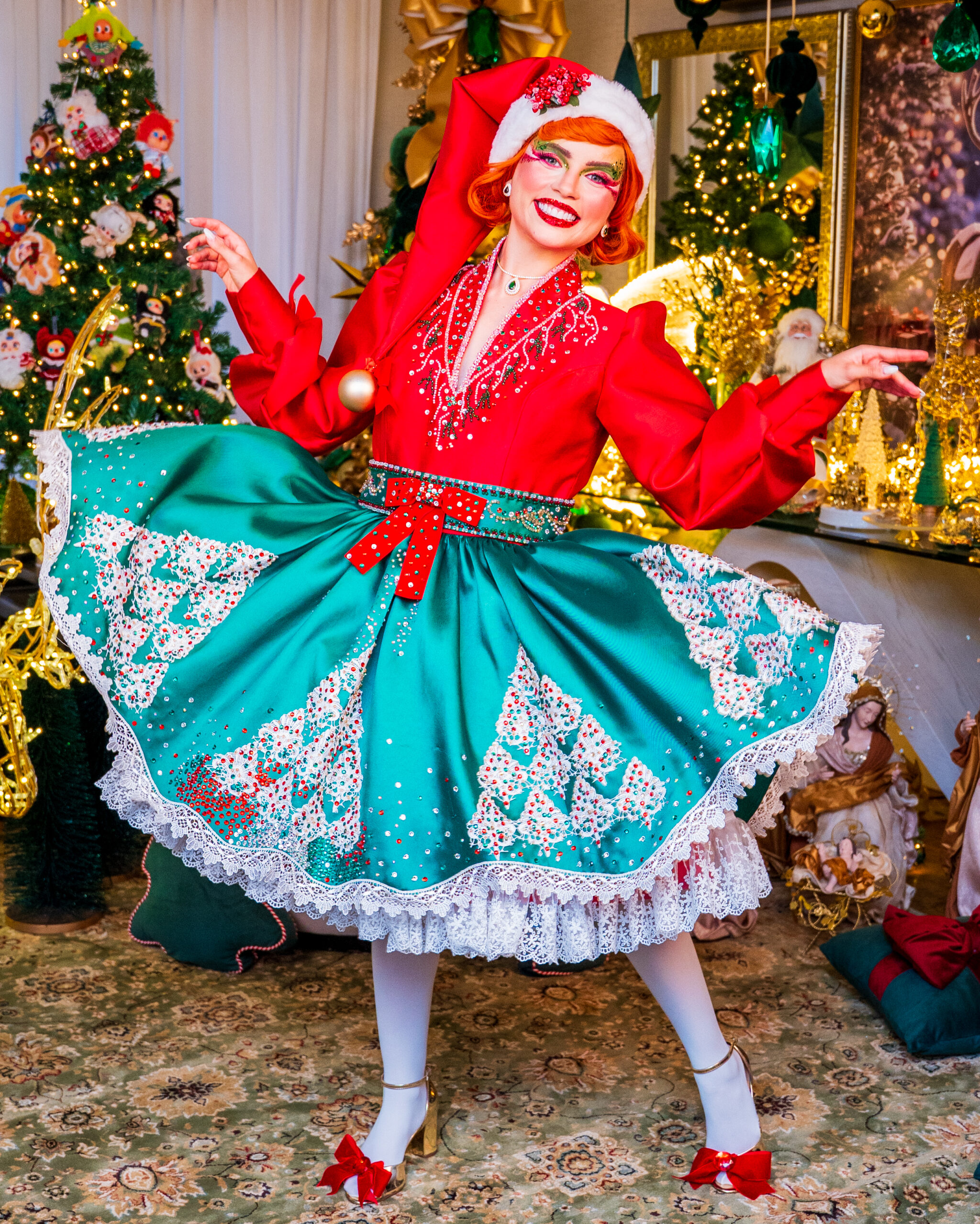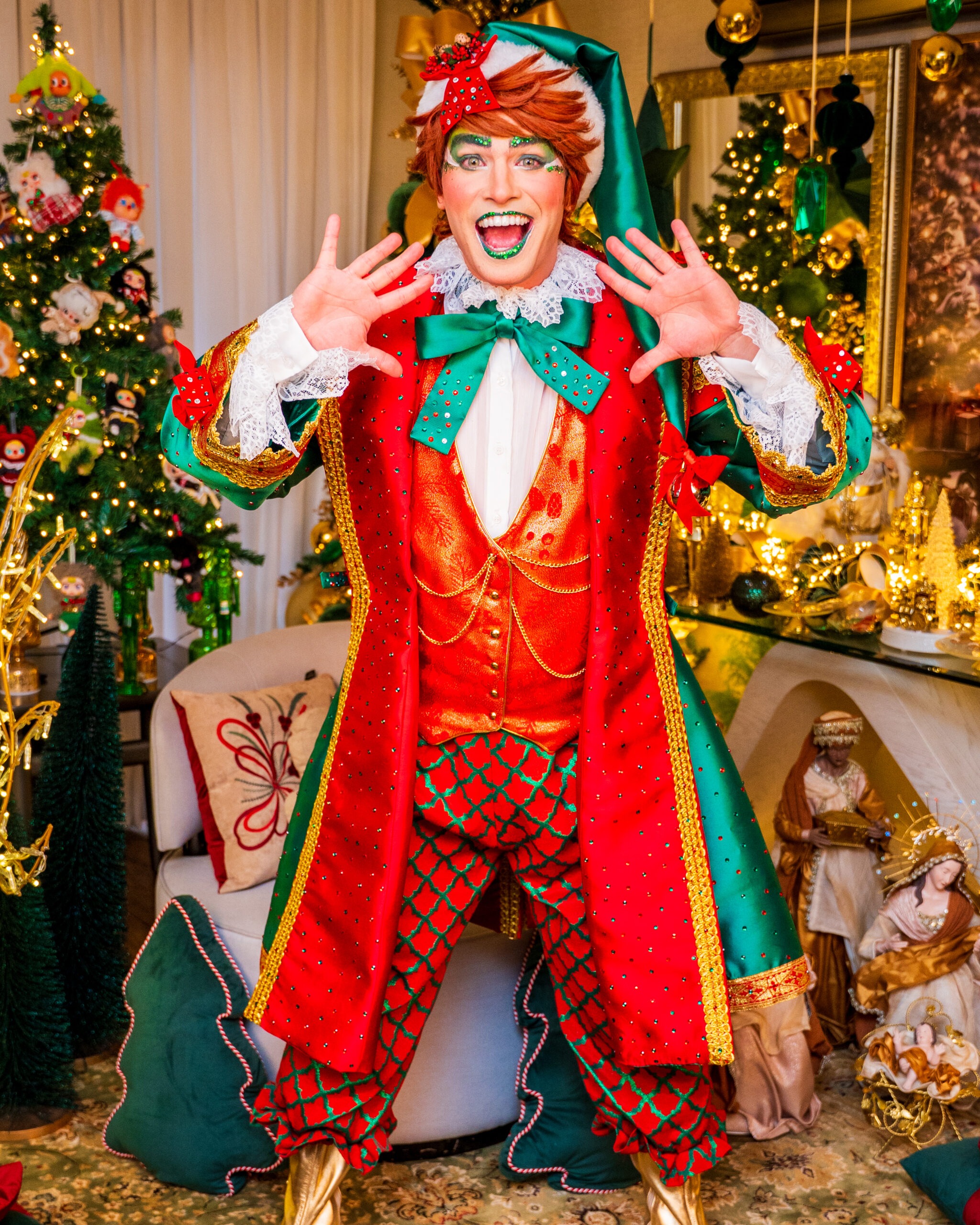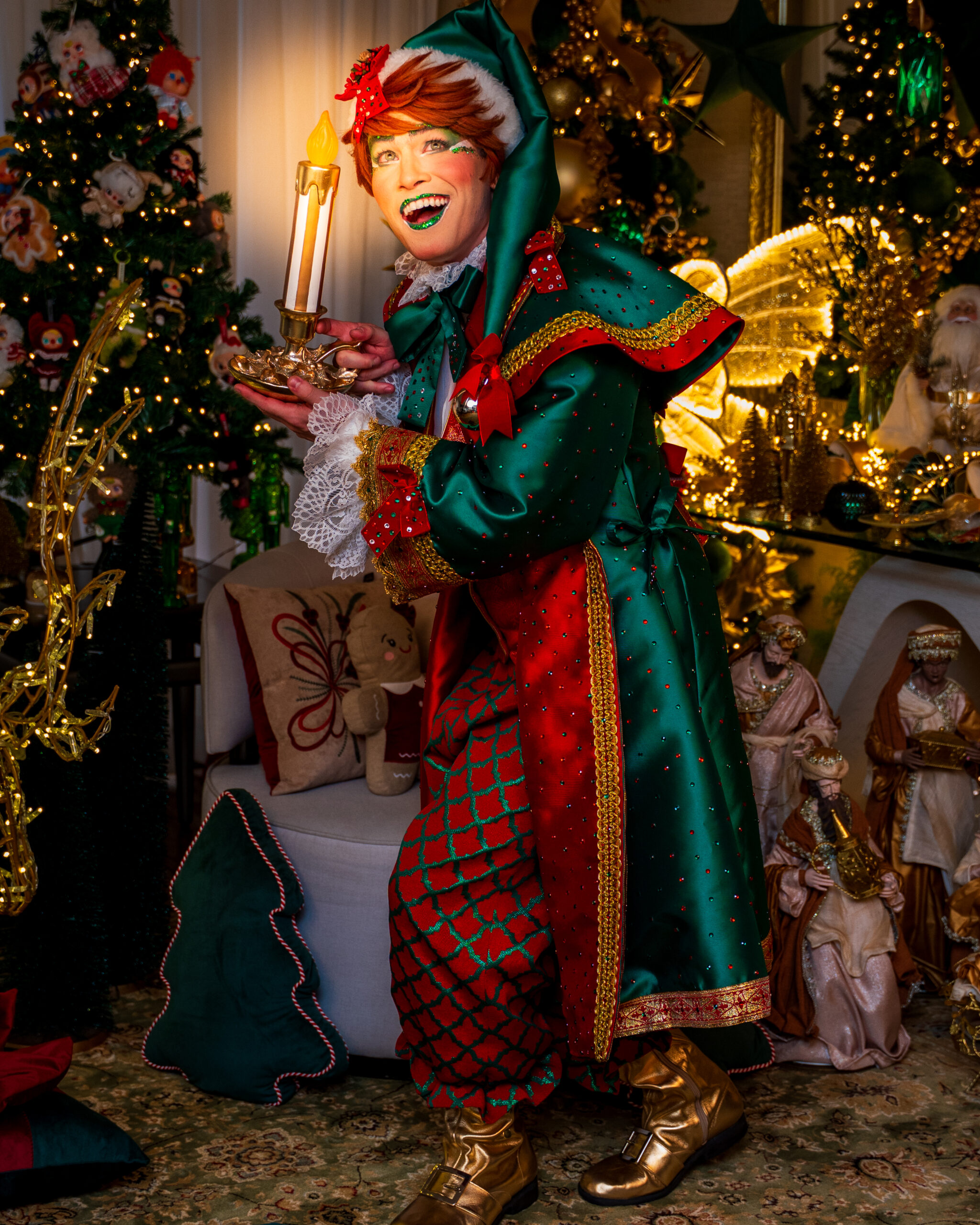 Com seus trajes brilhantes em tons de vermelho-rubi e verde-esmeralda, eles espalham risadas, energia e encanto por onde passam. Sempre animados e prontos para ajudar, transformam cada evento em uma festa divertida, colorida e cheia do verdadeiro espírito natalino.