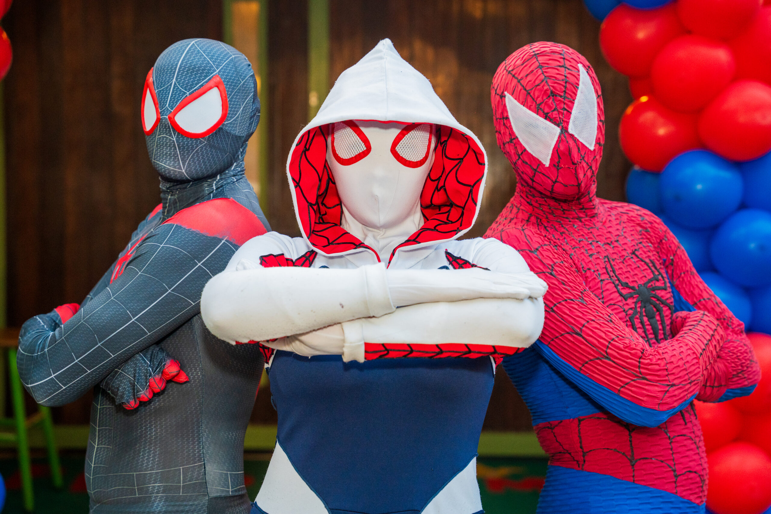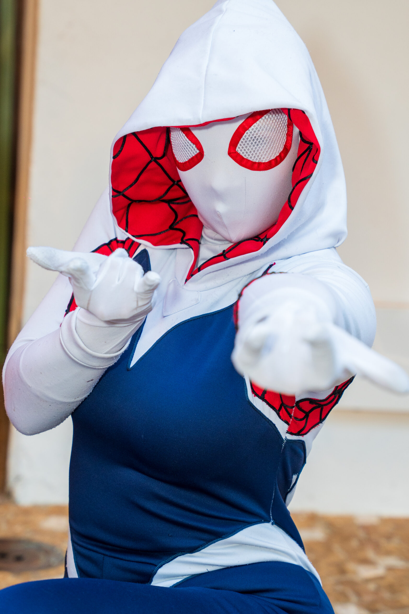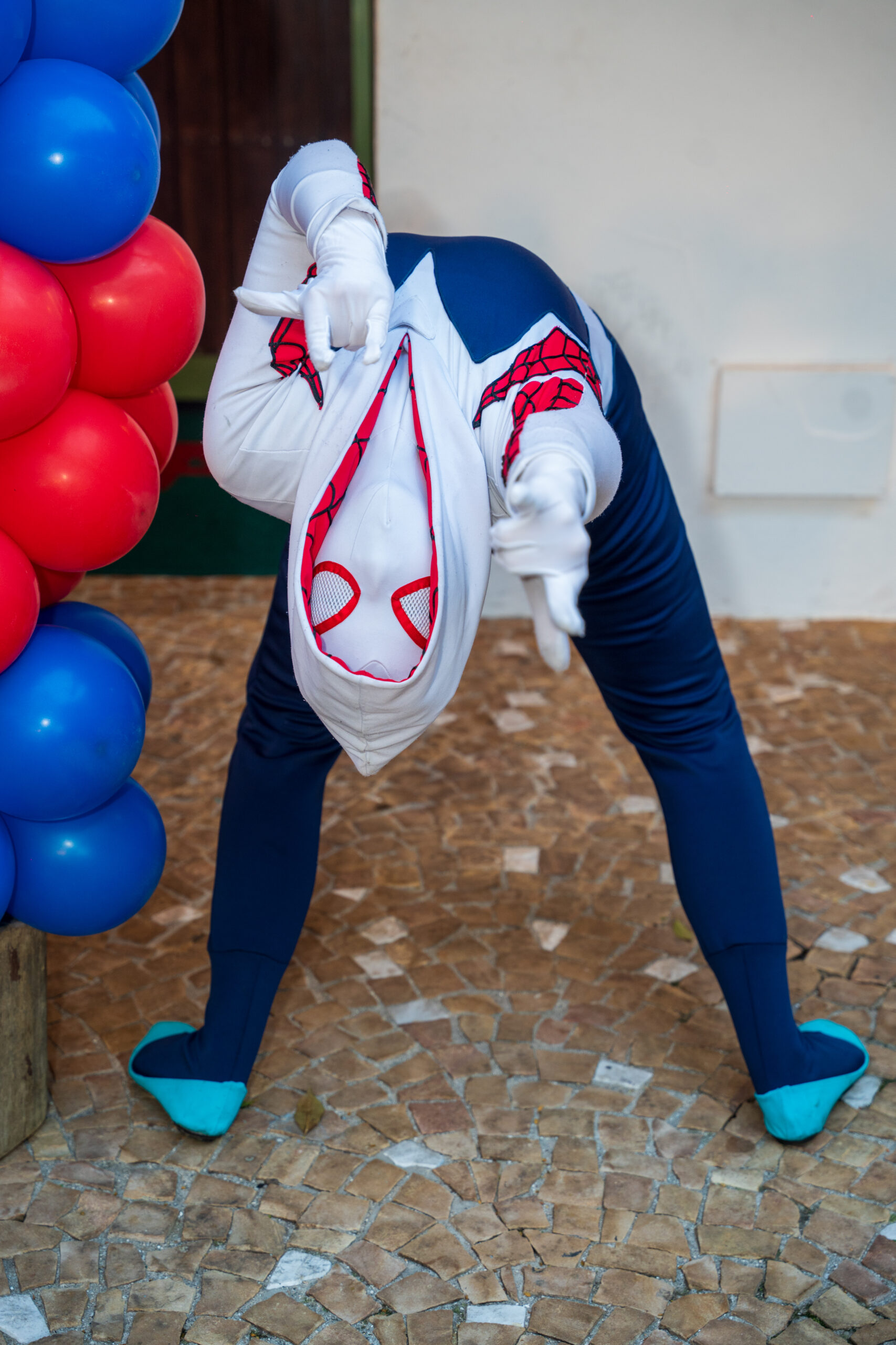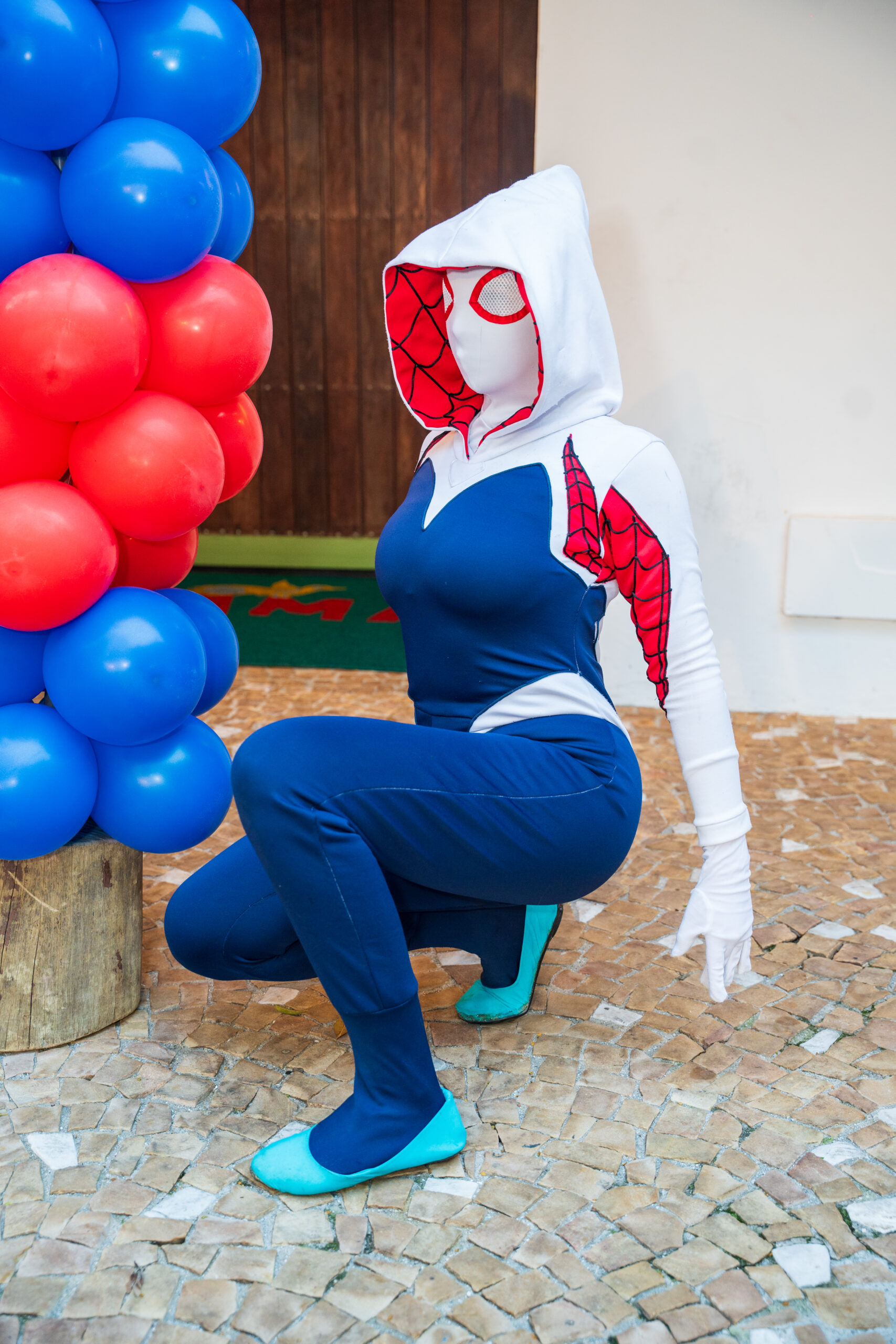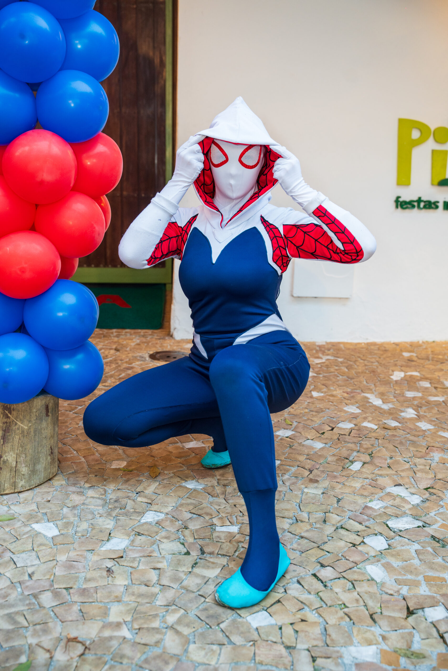 A Spider-Gwen é ágil, destemida e cheia de estilo! Com seu icônico traje branco, preto e rosa, ela traz um ar moderno e vibrante ao universo dos super-heróis. Ideal para eventos cheios de ação e aventura, encanta fãs de todas as idades com sua personalidade única e sua presença marcante.