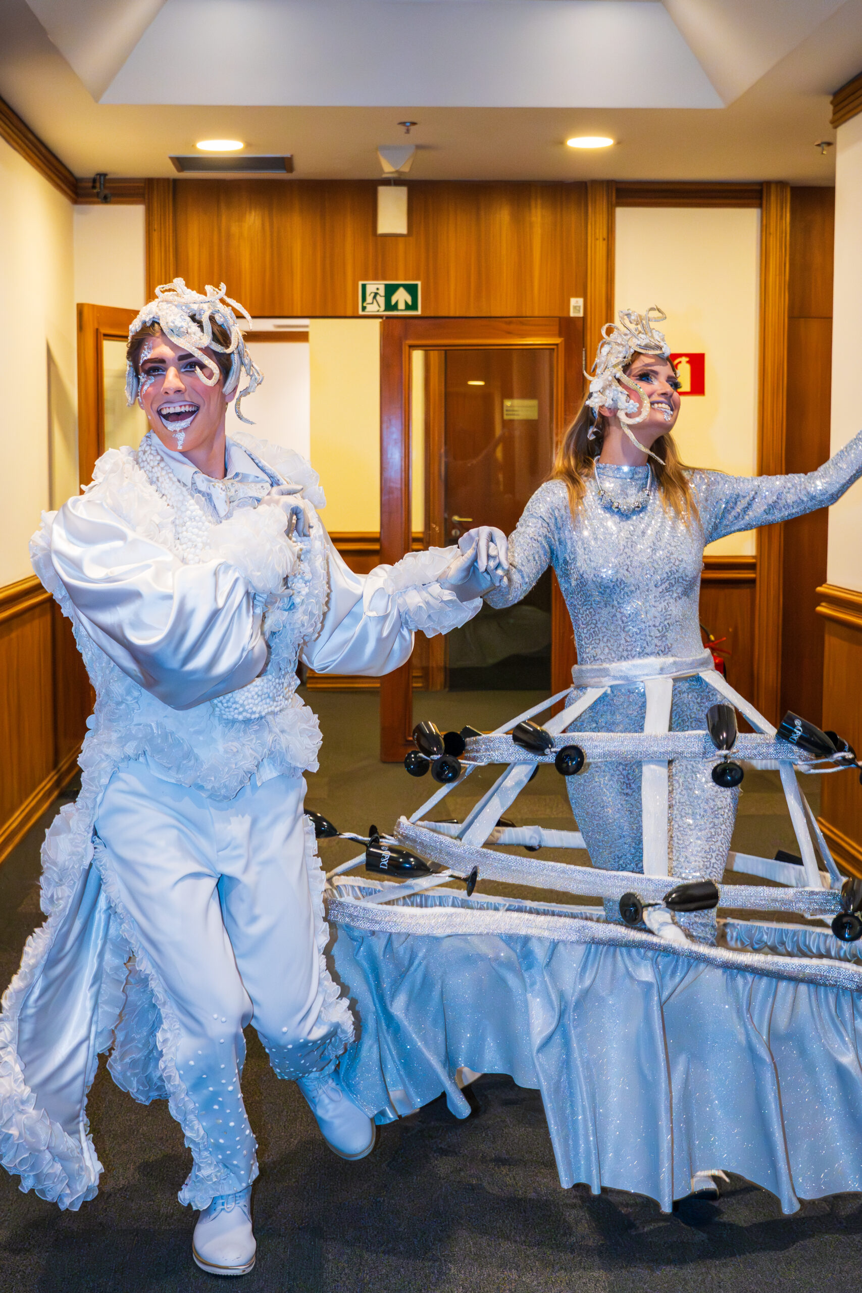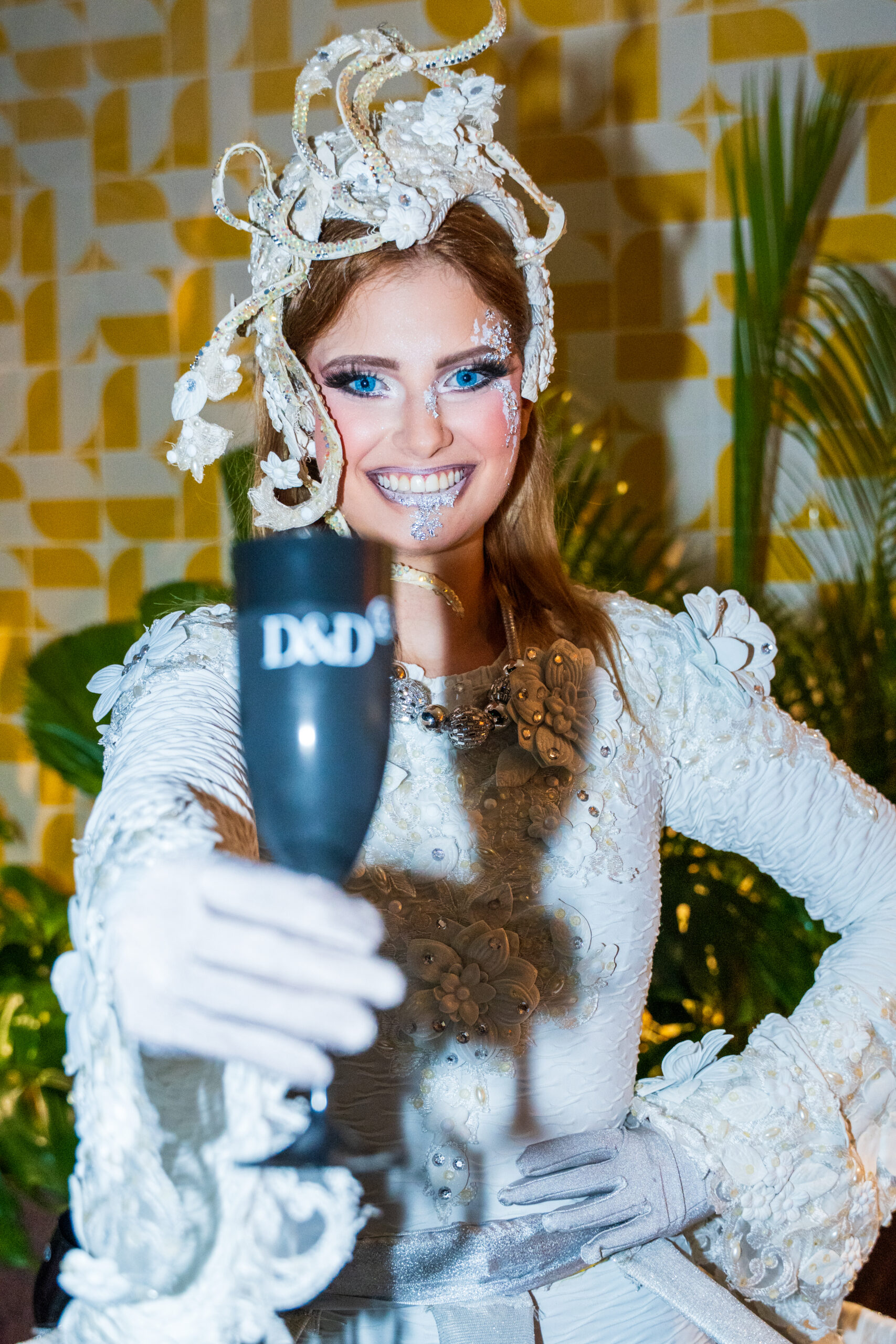 Elegância e encanto logo na chegada! A personagem Welcome Drinks Branca recebe os convidados com um toque de sofisticação e magia, servindo bebidas com delicadeza e um sorriso acolhedor. Vestida em branco reluzente, ela transforma o primeiro brinde da noite em um momento inesquecível — onde a festa começa com charme, brilho e alegria.